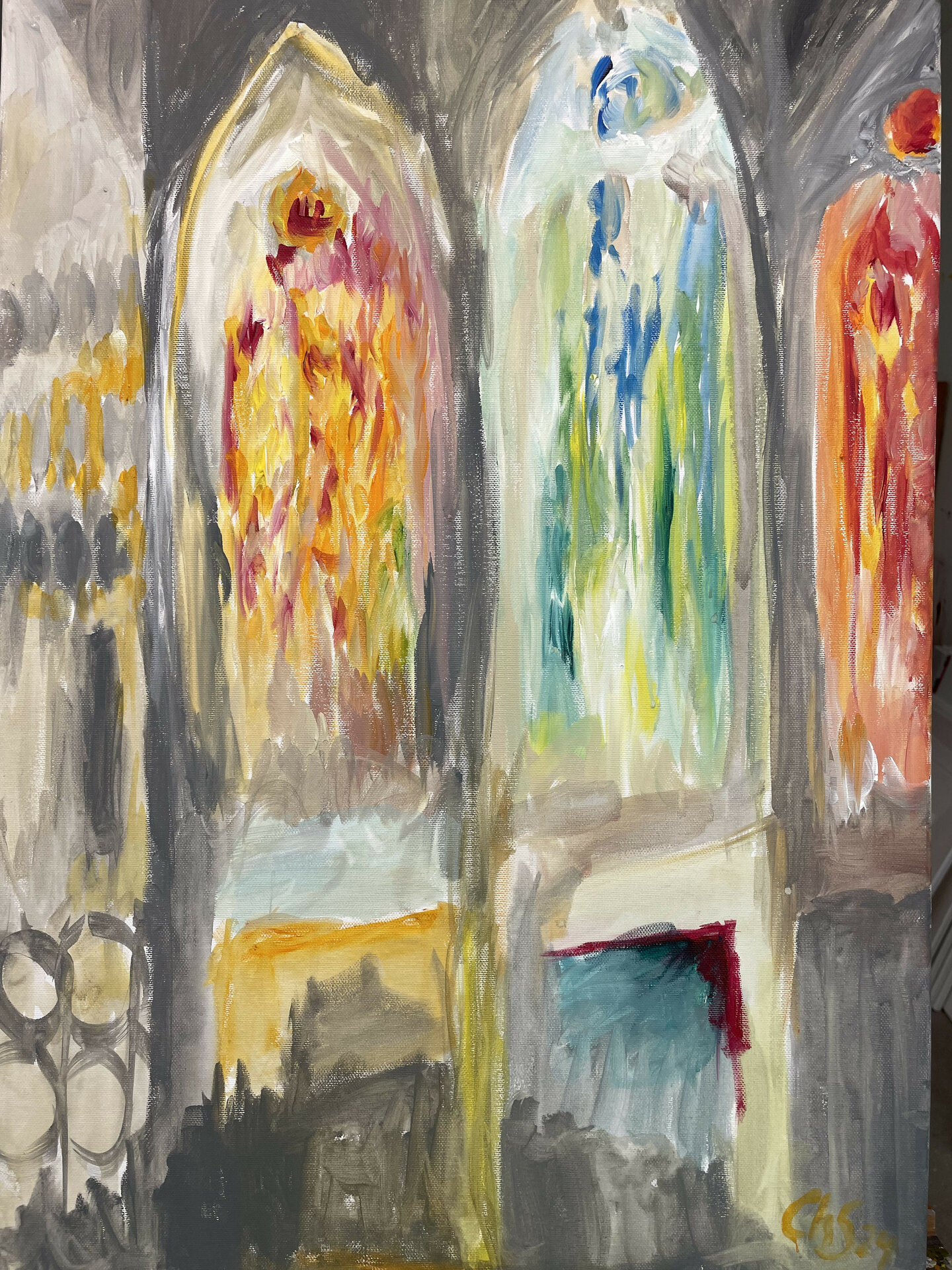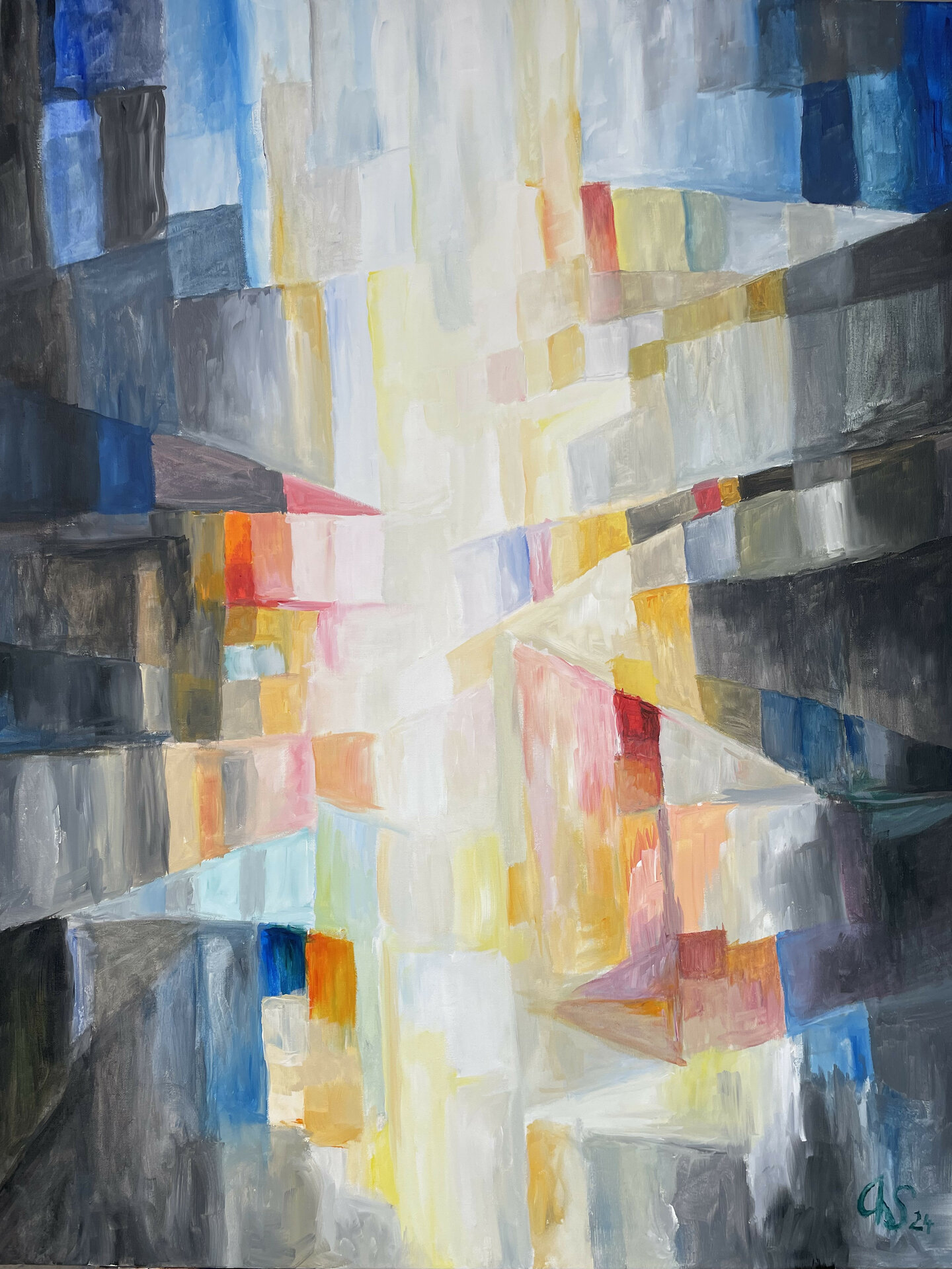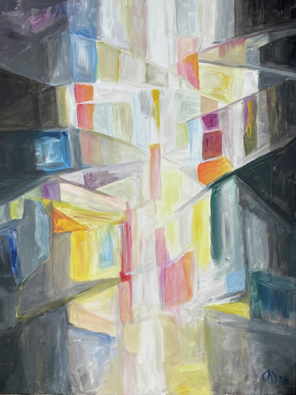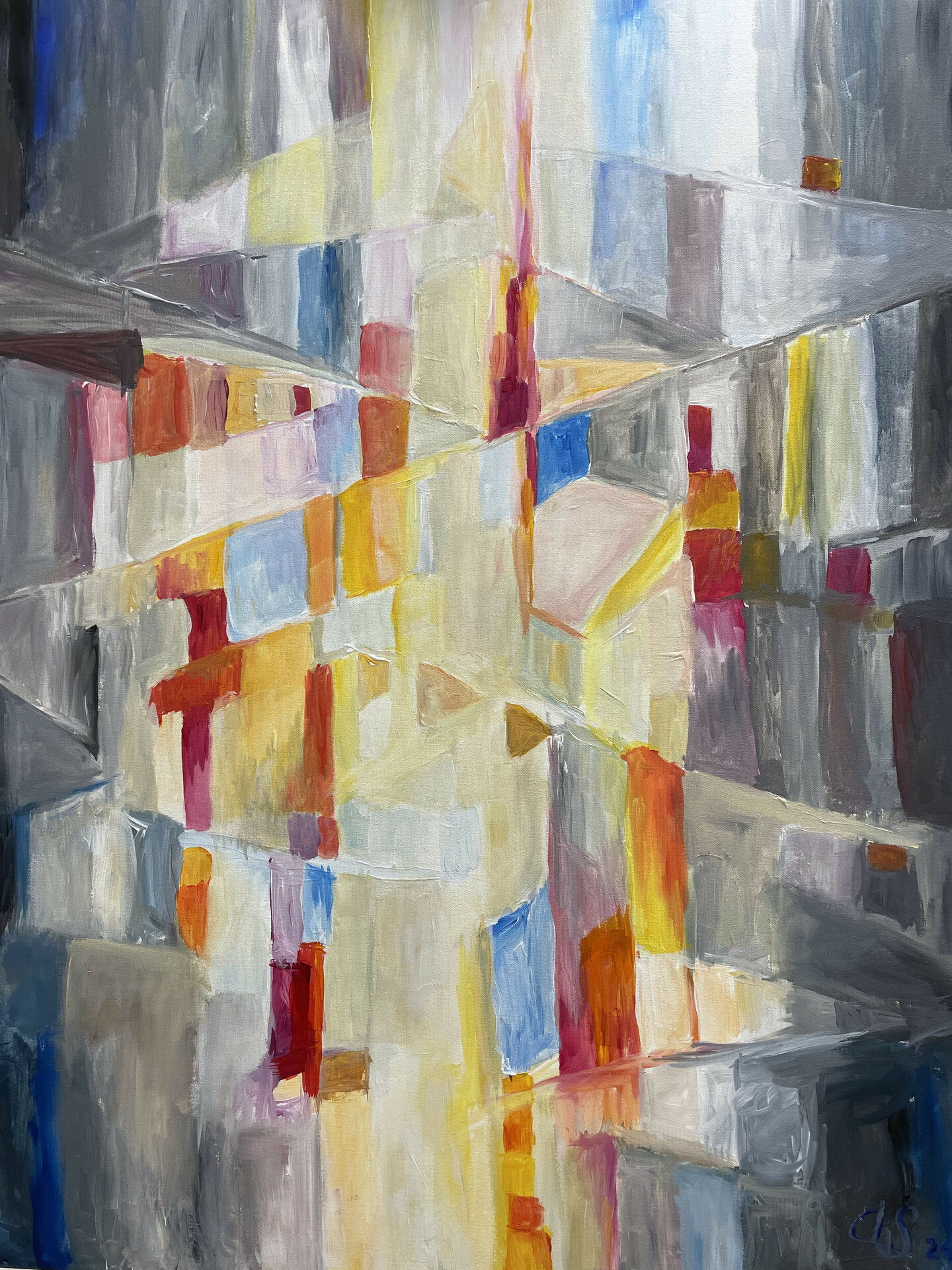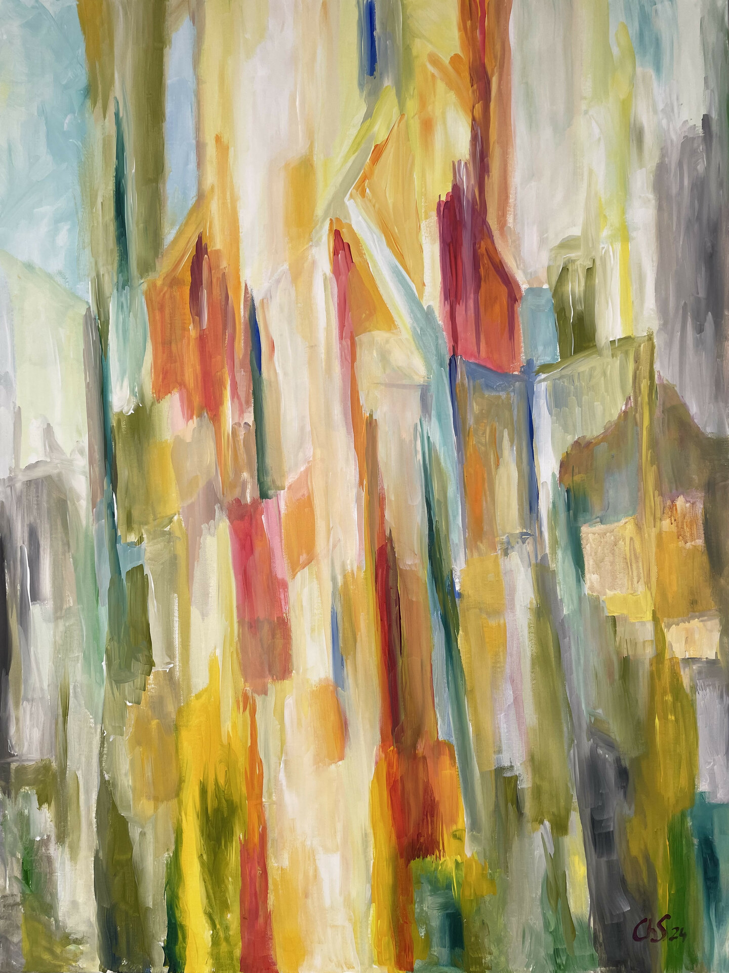 Kathedrale in Rot, Orange, Blau, 2024, 80x100cm